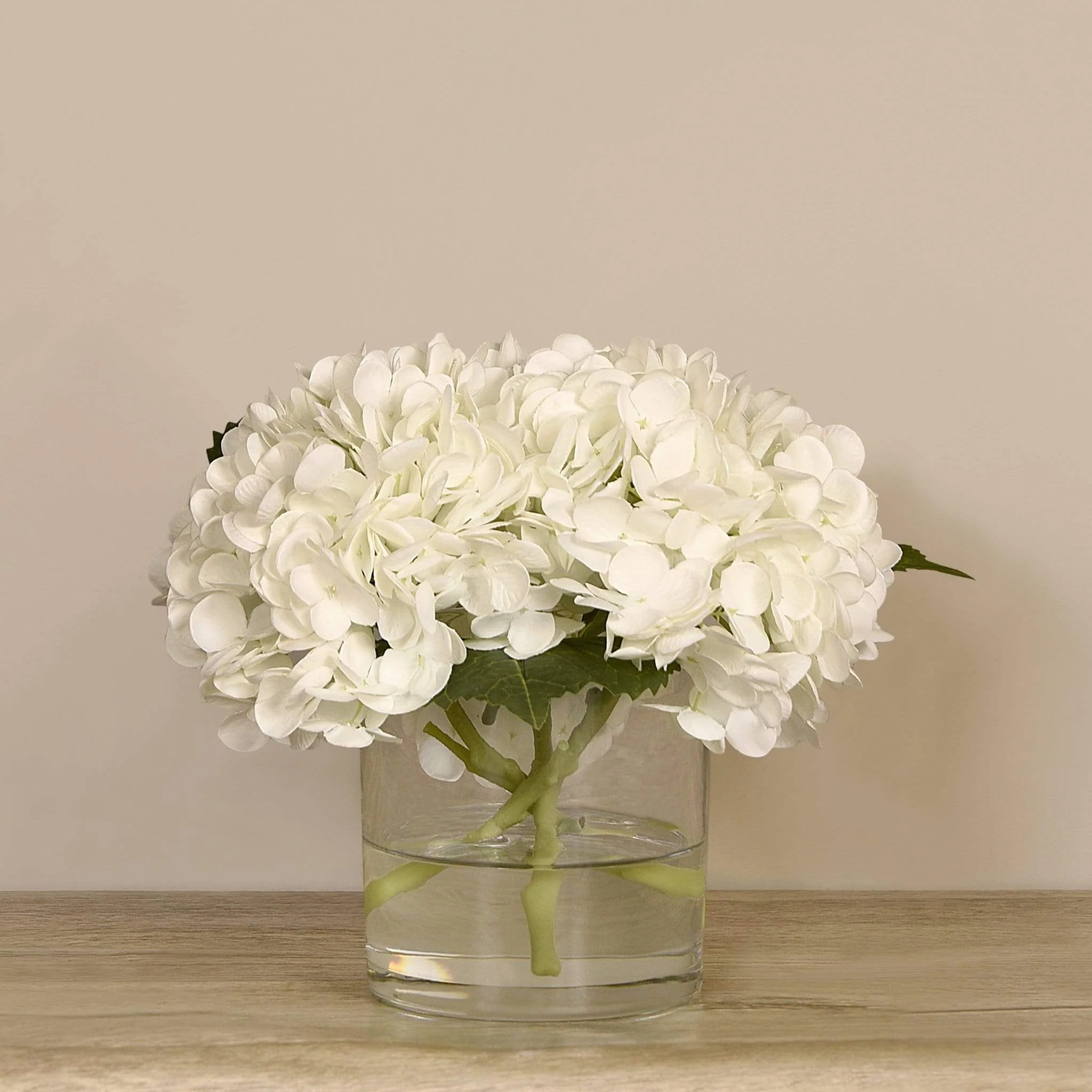 Get the delicate, mood-lifting look of fresh flowers in a glass vase with none of the hassle. Hand-arranged by expert florists, these hydrangeas look and even feel like the real thing.