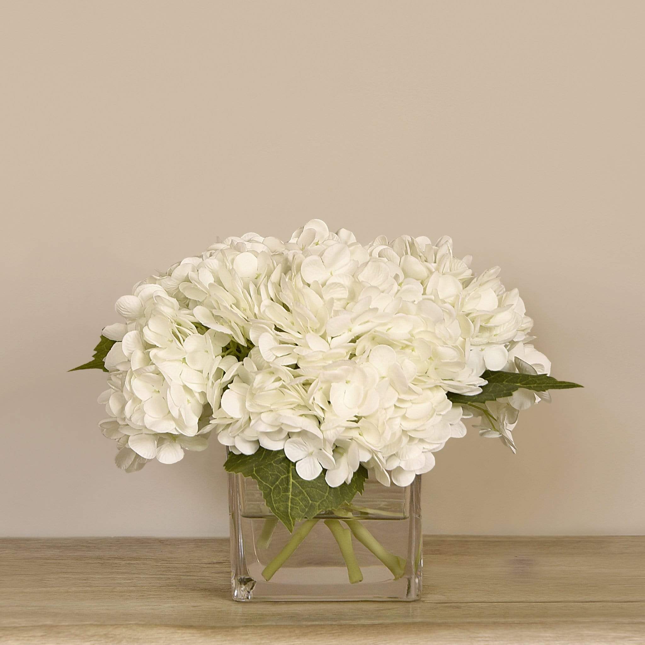 Get the cheery, delicate look of fresh flowers with none of the hassle. Hand-arranged by expert florists, these hydrangeas look and even feel like the real thing. The square glass vase adds a chic, modern flair.