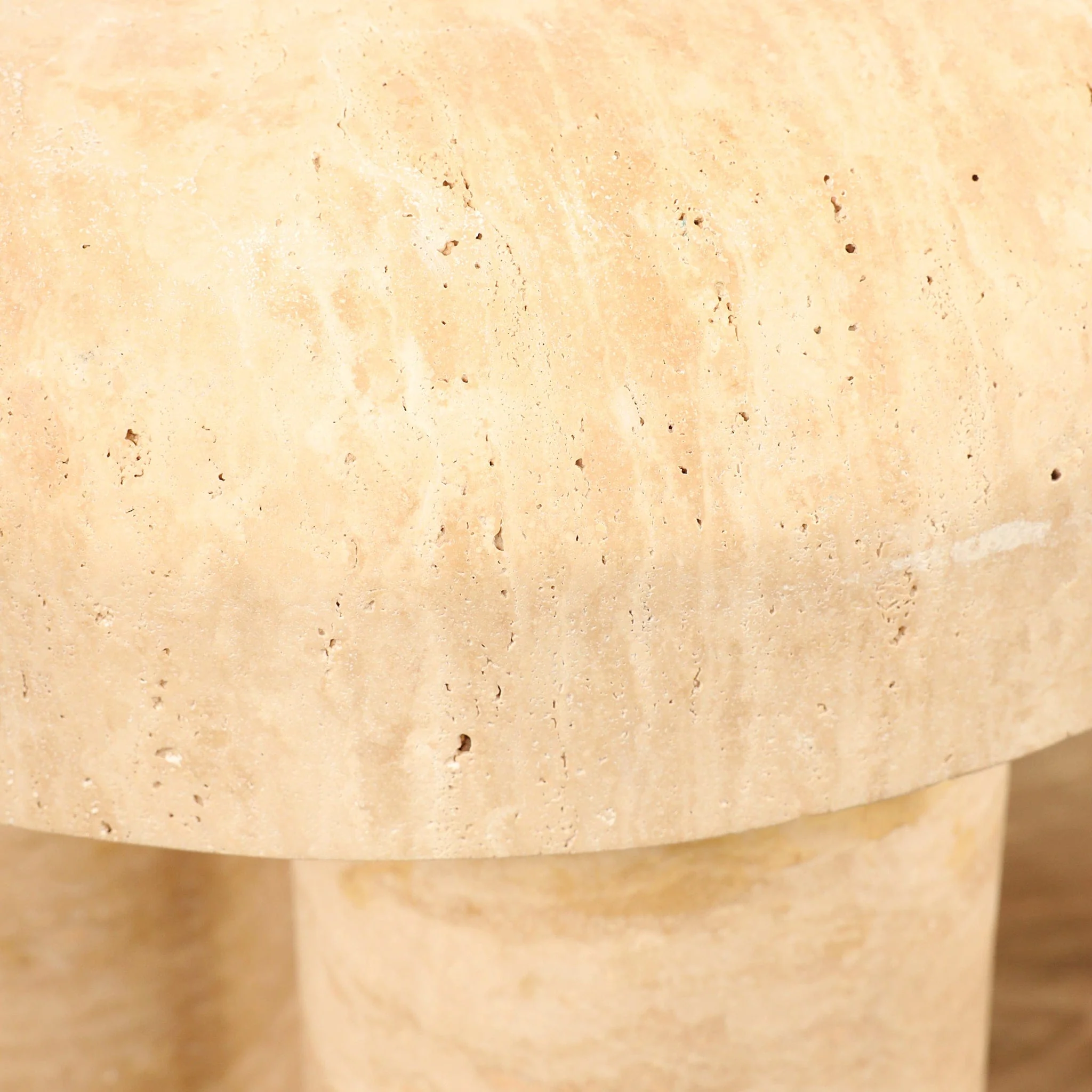 This modern side table boasts bold legs for a solid presence in any decorating style. Celeste is crafted in solid travertine for natural beauty. Its veins and variations will lend movement and interest to a space while its compact form is ideal for small spaces.