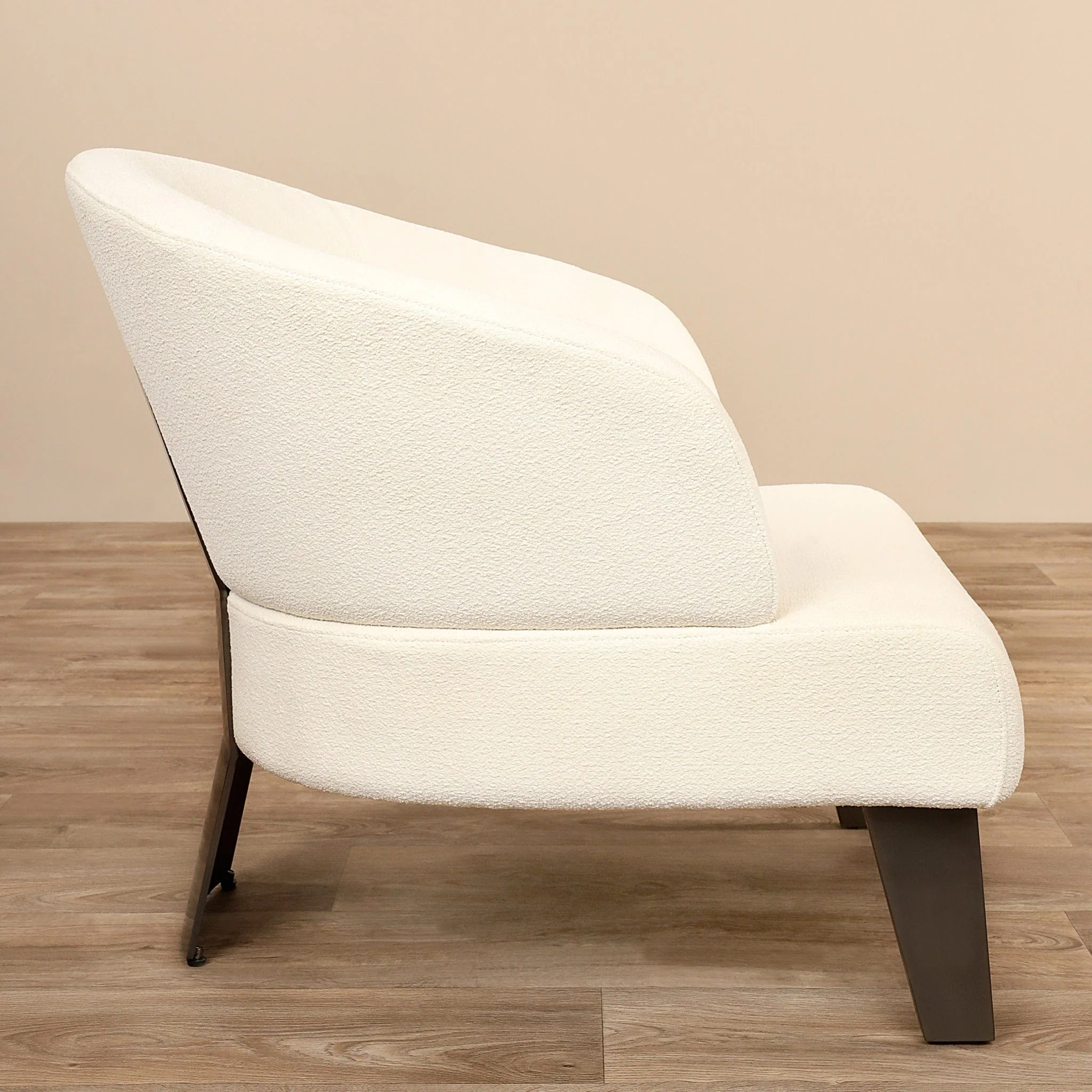 This Ilona Armchair is cleverly seated on three legs and takes its cues from mid-century modern style. Streamlined and sophisticated Ilona casts a dynamic silhouette to add style to a seating area. Crafted with stainless steel legs, this contemporary chair is expertly upholstered in boucle fabric for the perfect finishing touch.
